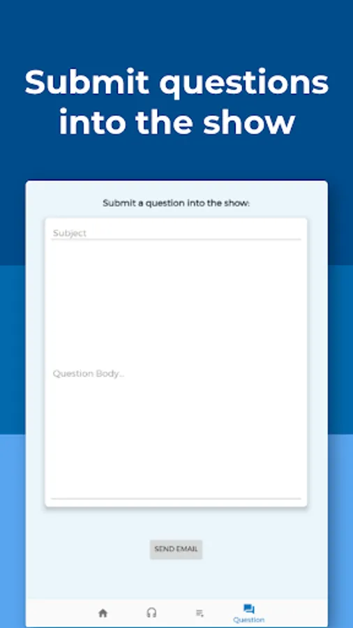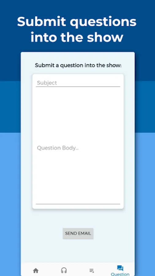 • Question page where you can submit questions into the show via email