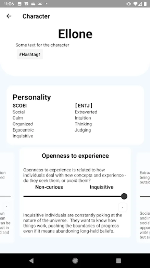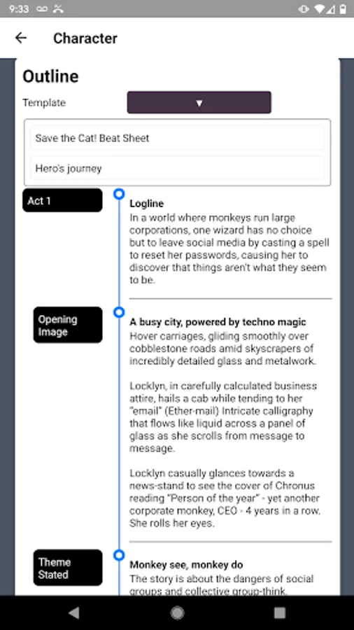 Personara is a character development app using guidance from psychology - for stories, world building, screenwriting, or any creative endeavor. Simply adjust a few sliders to set a character's personality and the app will suggest traits and motivations. Additional modules let you outline a character story (with templates such as Save The Cat! beat sheets and Hero's Journey), track a character's lifepath (relationships, achievements, setbacks), provide details on their upbringing, spirituality, physical traits, skills, education, and work history. Tag individual characters for quick-reference information. Supports multiple stories and multiple characters per story.