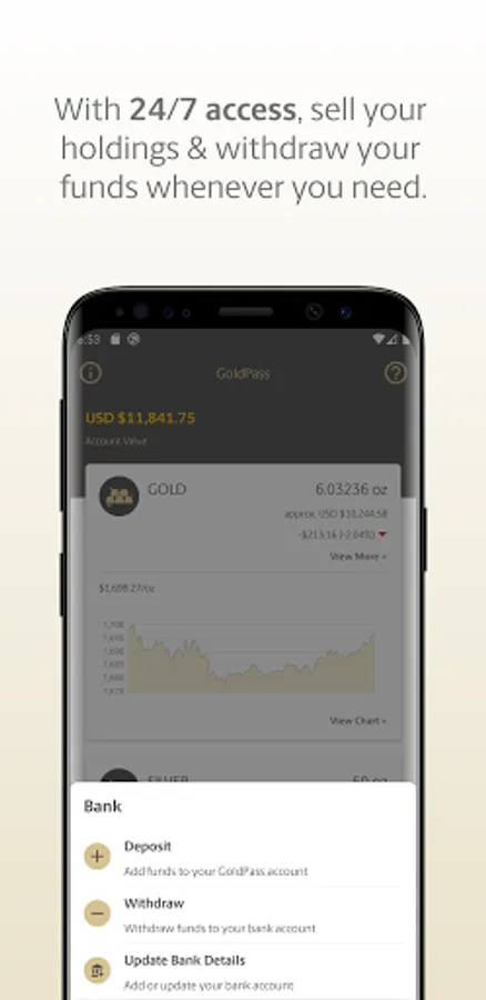 GoldPass allows you to easily buy and sell your digital gold or silver holdings with each transaction recorded in the app. With 24/7 access you can sell and withdraw your funds whenever you need.