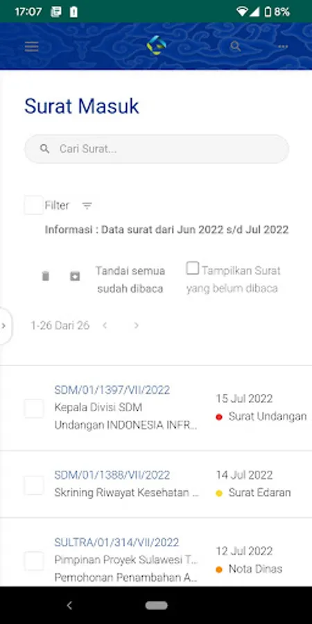 E-Office adalah aplikasi persuratan yang dikembangkan secara InHouse oleh Divisi Teknologi Informasi yang merupakan digitalisasi proses tata persuratan yang sudah berjalan selama ini dengan cetak kertas. Semua proses persuratan diharapkan tidak dilakukan lagi secara manual sehingga memiliki Salinan dalam bentuk digital yang dapat mengefisiensi proses dan biaya. Dengan adanya aplikasi ini, seluruh surat masuk eksternal Kantor Pusat akan diterima, disalin dalam bentuk digital yang kemudian akan didistribusikan ke masing-masing penerima oleh Sekretaris Perusahaan. Surat masuk ekternal yang ditujukan ke Proyek/Bisnis Unit diterima, disalin dalam bentuk digital dan didistribusikan ke masing-masing penerima oleh PIC masing-masing Proyek/Bisnis Unit.