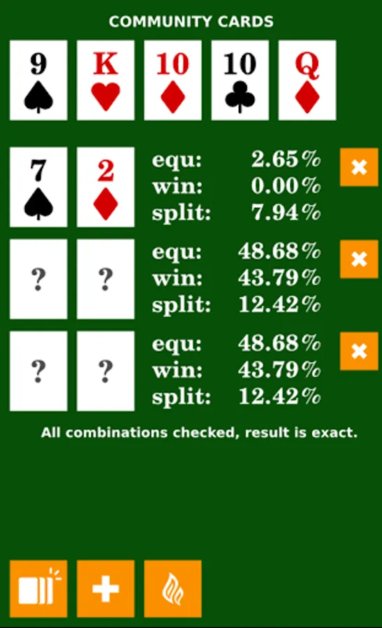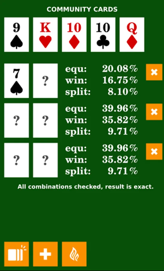 This Poker Odds Calculator is a free (Ads supported) version of Poker Odds Calculator Pro. If you want to donate development of Poker Calculator buy full version now.
