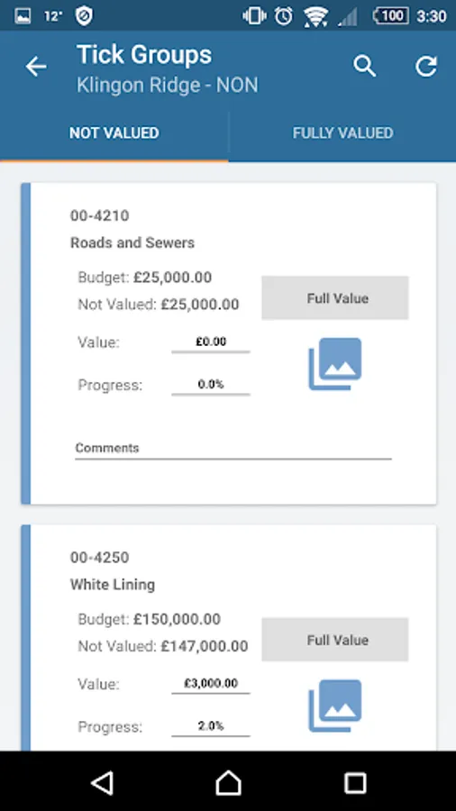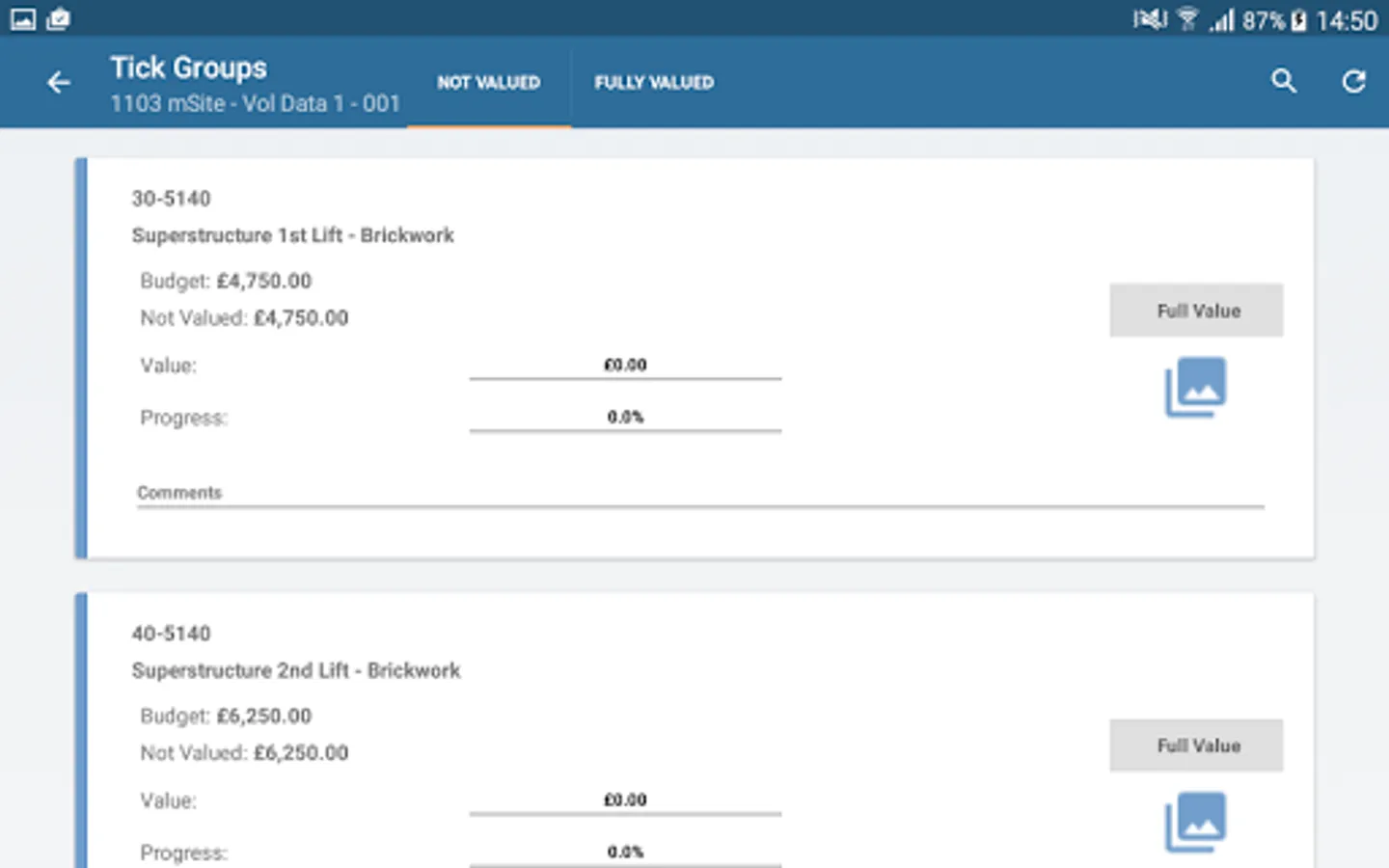The valuation or percentage of completion of each of the tick-groups is captured. It is possible supplement this information by attaching comments and photos.