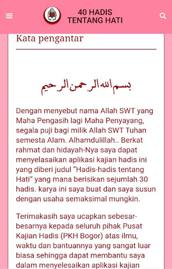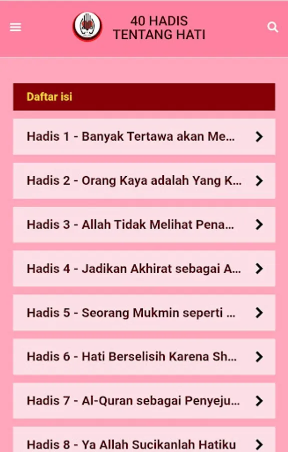 This hadith digitization application is entitled 40 hadiths about the heart, in which the author hopes that with this application it can help the community a little in controlling the heart as in the hadith of the Prophet, because every human being is gifted by God with a heart as the main tool for knowing Him. The heart can determine the good and bad of a person before God, because the place to understand and control oneself is in the heart