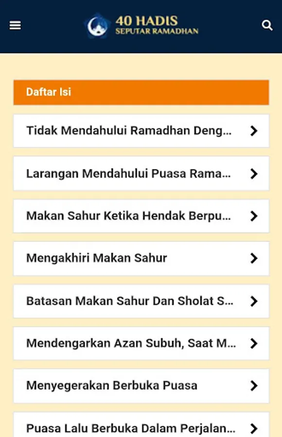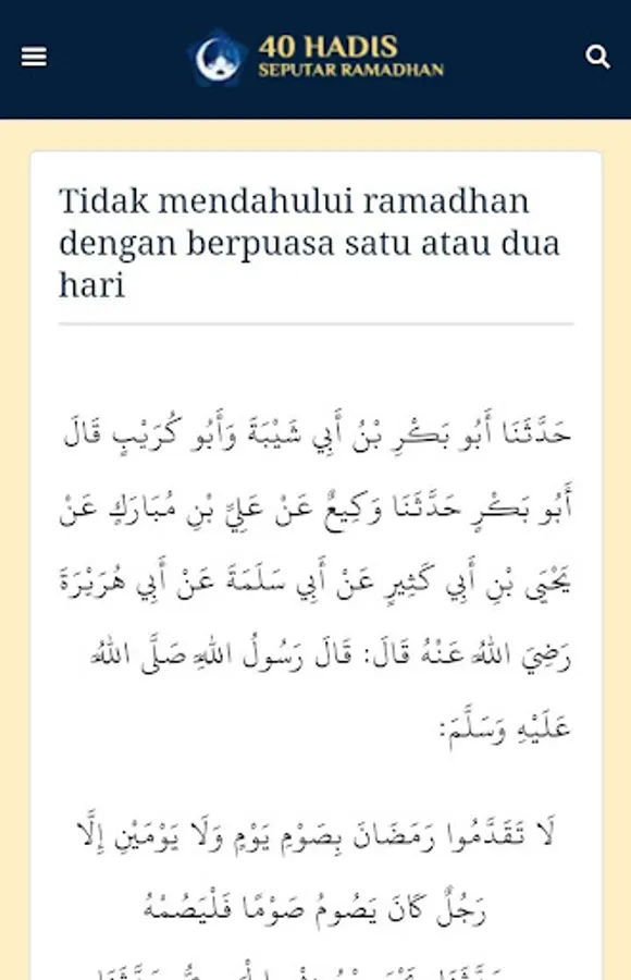 With the presence of this application, hopefully benefit to the entire public at large, particularly for activists traditions in seeking arguments of shari'ah. In the end, I would like to thank all, especially the FUSHPI and PKH who have supported and helped for the presence of Applications "40 Hadith Regarding Ramadan". May God give you an abundance of grace and of His Mercy to us all.