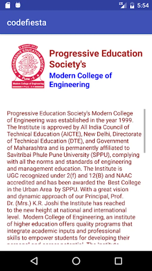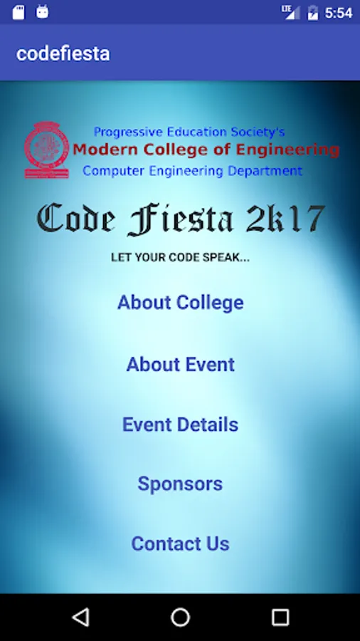 App providing details and glimpses about Technical fest under M-pulse ‘CodeFiesta 2k17’, on 10th and 11th February 2017.CodeFiesta 2k17, the event started with an intention to provide students with an effective platform to face competitive activities. Code Fiesta has 3 events which demands coding, problem solving and critical thinking skills. All the events have been planned and organized by students and coordinators keeping the interest and need of the technical students into consideration.