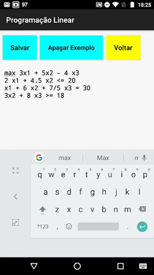 The application allows to solve "classic" Linear Programming problems with up to 10 decision variables and 10 restrictions using the 2-phase simplex.
