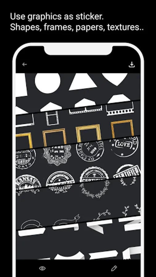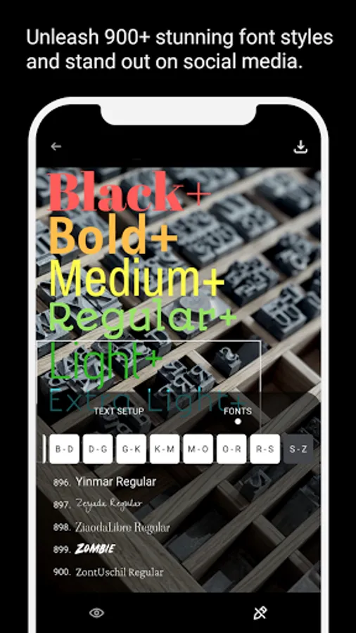 • Over 900+ fonts, multiple text & font sizes, opacity, colors, positions, perspectives (transform angles), rotation, bold, italic, capitalize, centration, line spacing and letter spacing, wrap text, flip, mirror.