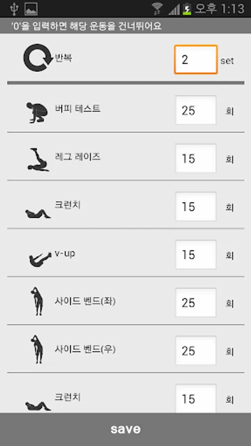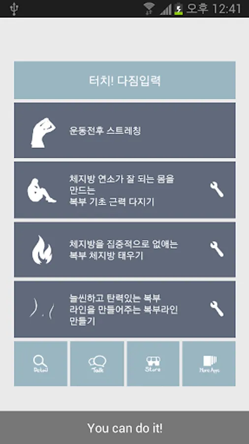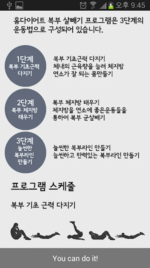 In addition, based on the chopper abdominal muscle exercises, abdominal fat burning, slim sports were separated into three steps can make the abdomen lines the user selects the desired movement and posture during exercise can be explained, as well as exercises with the sound of the counting application.