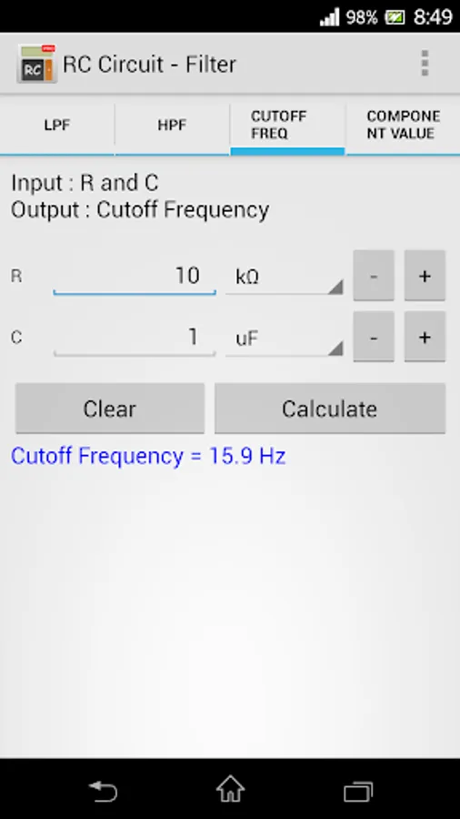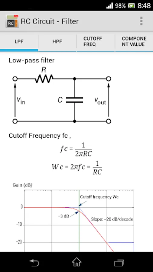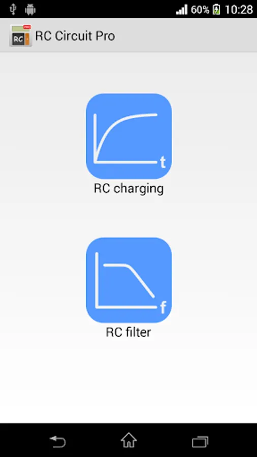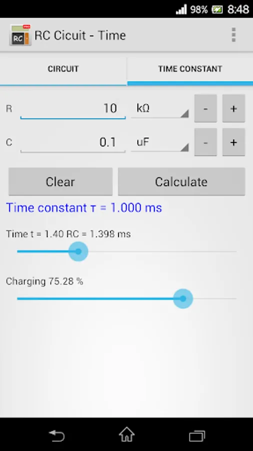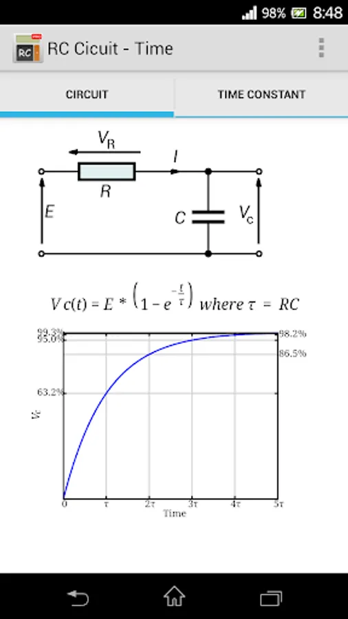 This app is used to calculate the RC charging circuit and RC filter. It is suitable for hobbyist or electronic engineers.