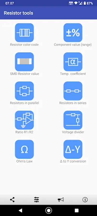 This app is a collection of resistor calculators. It is suitable for hobbyist, electronic engineers or professionals.