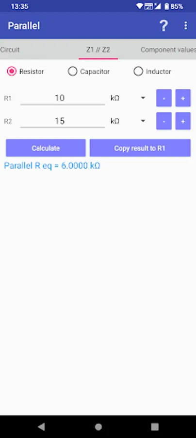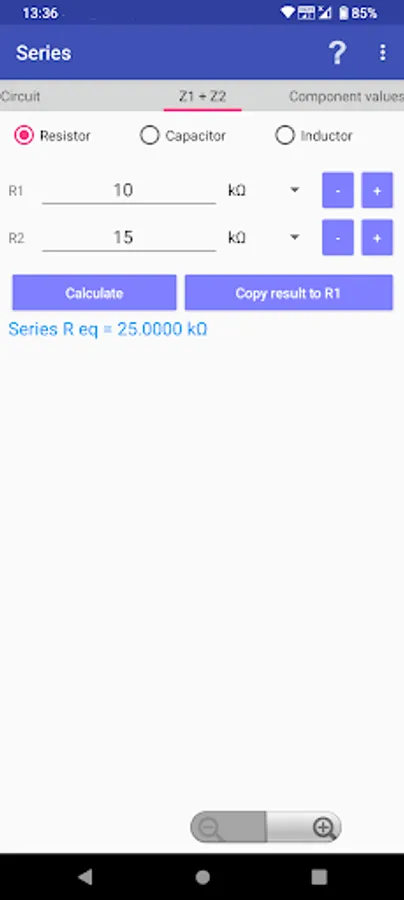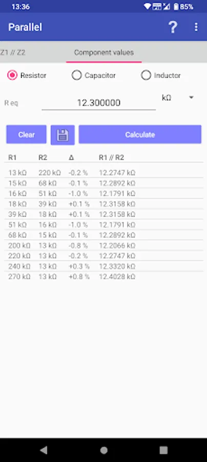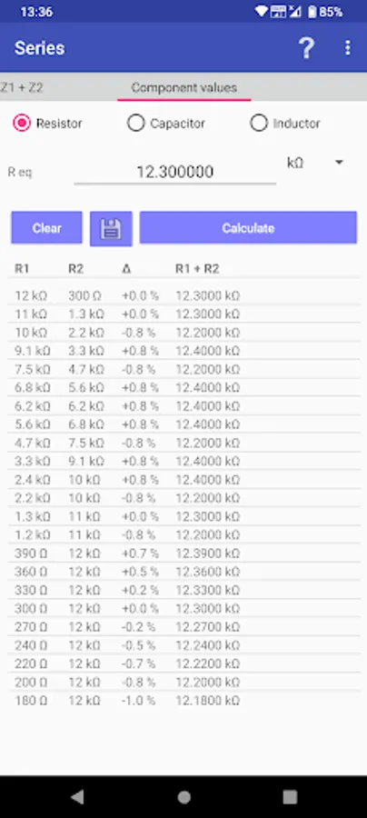 When you do not have an exact resistor value in building a circuit, you need to combine two resistors either in series or in parallel. This app is used to find out all the combinations of these resistors making a desired resistance.