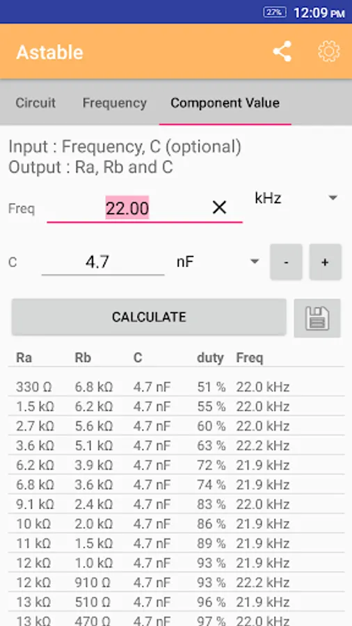 3. Calculate component values of monostable and astable circuit. Save component values in CSV file (Excel file)