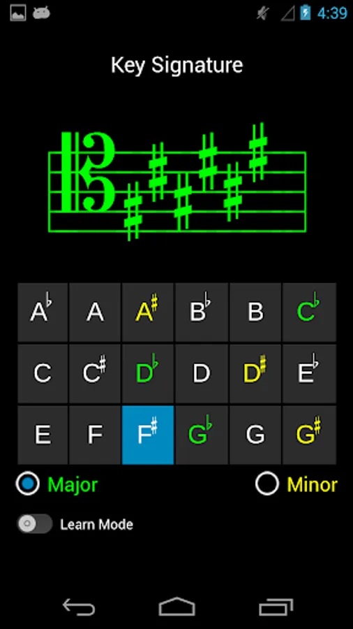 With Learn Mode off pressing a key signature button shows the associated key signature. With