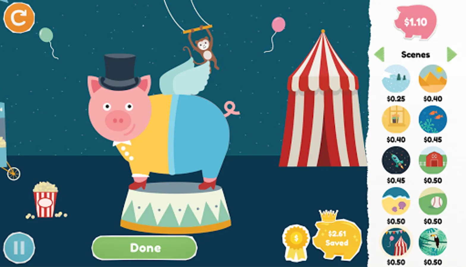 This educational game allows young kids to help Peter Pig count and sort coins. It can help them develop important money skills. Children learn to make purchases within a budget, put money aside for savings and are rewarded for good saving habits. Features include three interactive games, fun facts about money, savings tips, a trip to the virtual store where kids can buy accessories to dress up Peter Pig and save a photo to their device.
