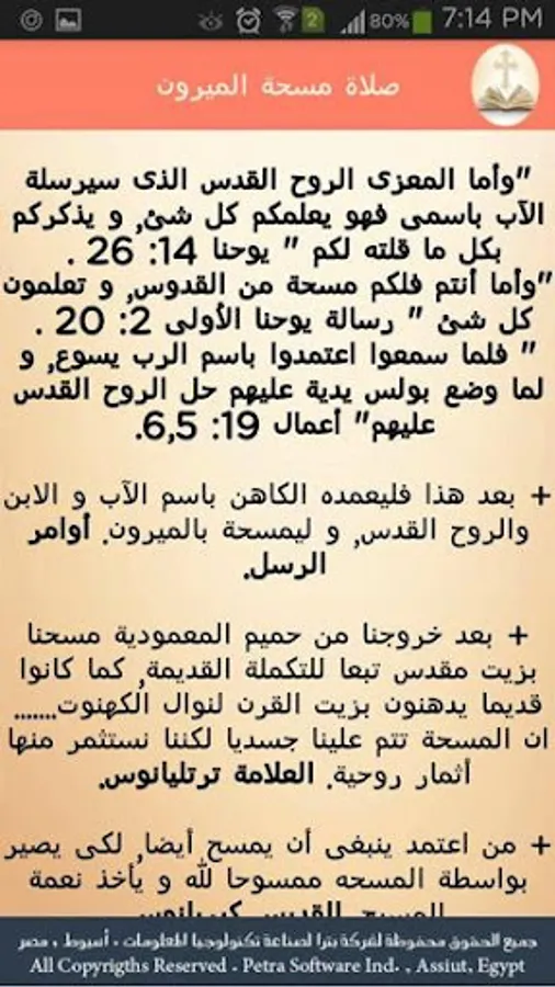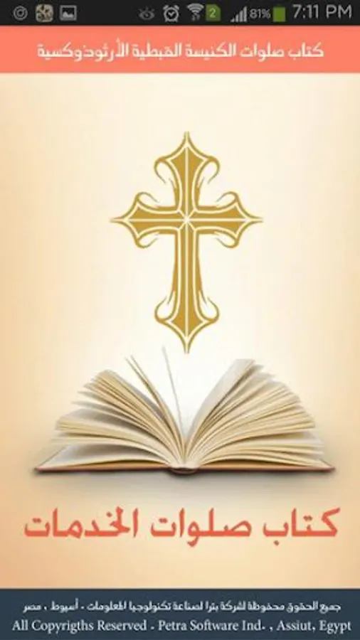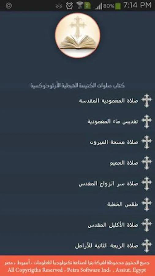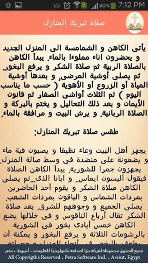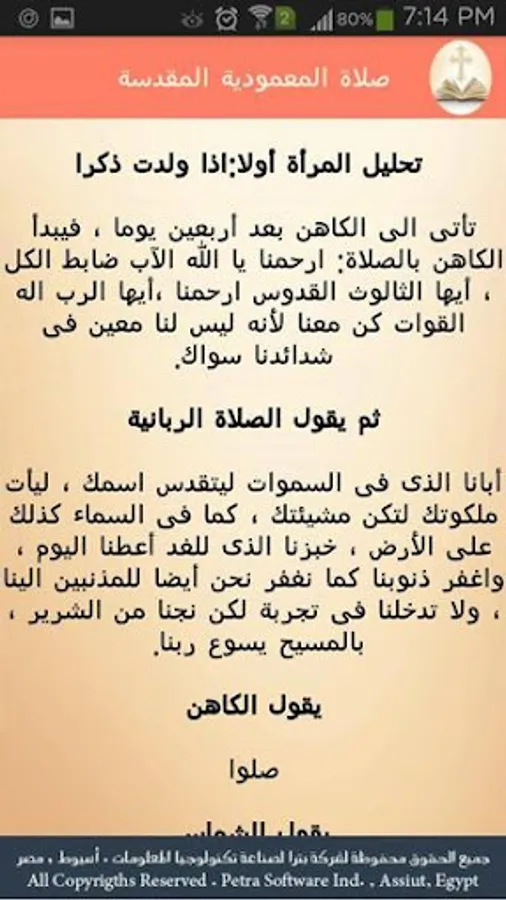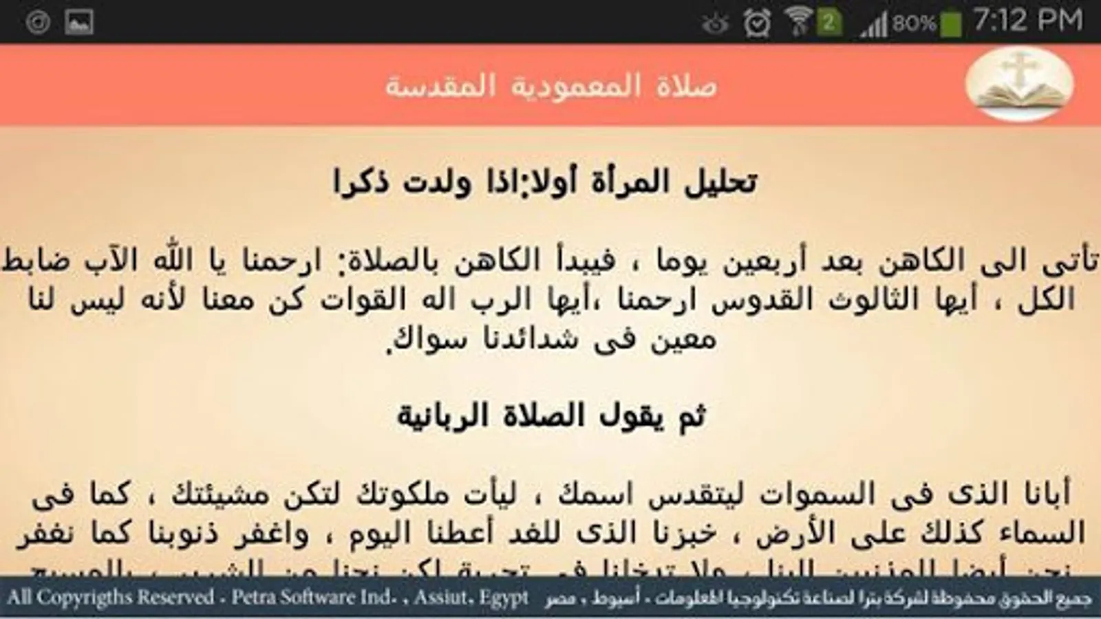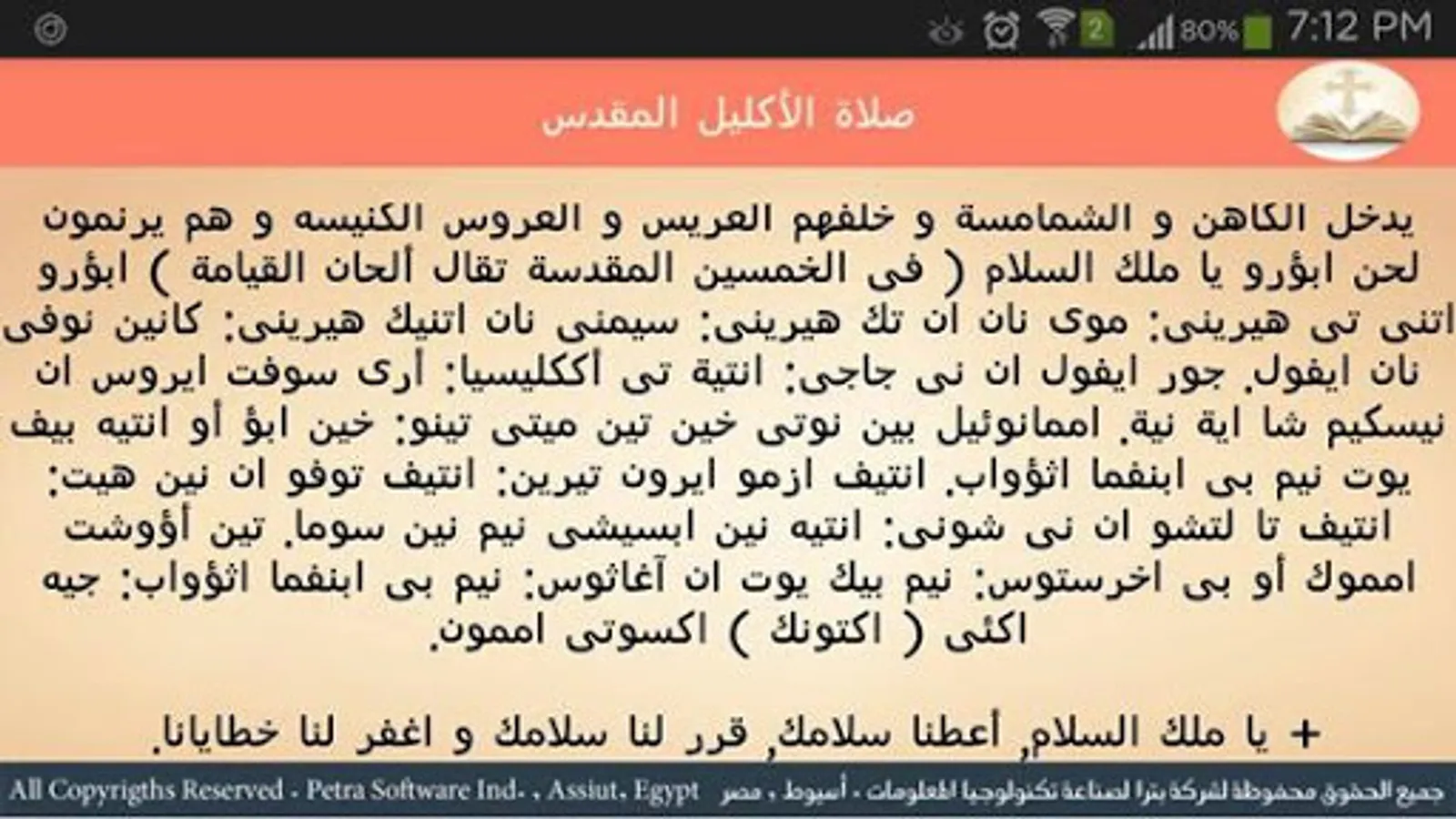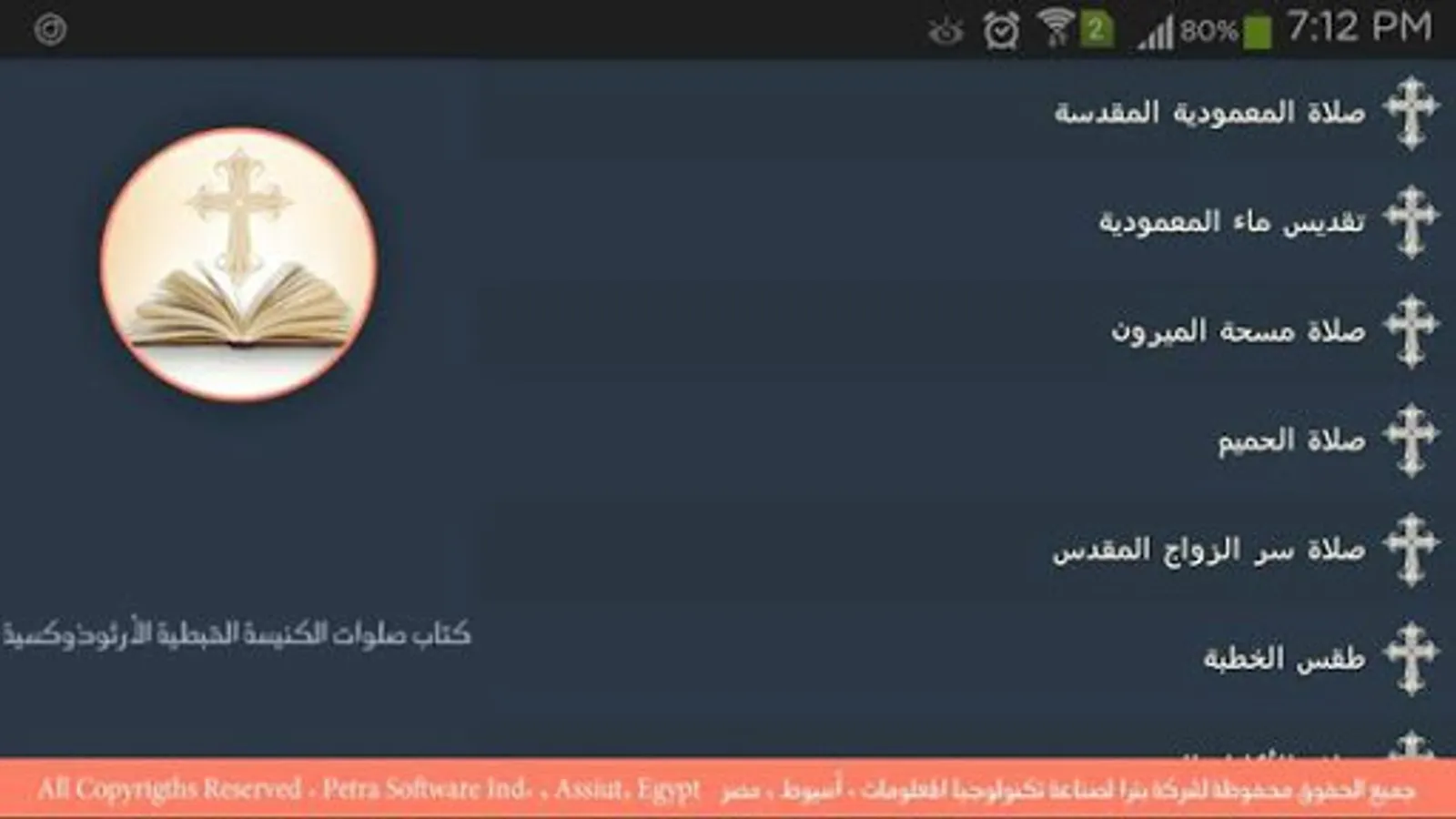 Prayers of services by the Coptic Orthodox Church - Application Ali has the following ritual prayers: prayers of the Holy Baptism - the sanctification of water baptism - prayer swab Chrism - BEST - prayer is the mystery of the Sacred Marriage - Weather sermon - prayer of the holy crown - prayer marriages of widows - prayer anointing of the sick - prayer blessed homes