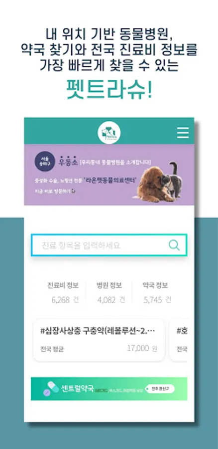 Pettrache is a website that provides medical expenses inquiry, disease search by symptom, veterinary hospital, pharmacy search, and hospital reservation service so that you can find the best veterinary hospitals and pharmacies based on your location as well as the national veterinary hospital medical expenses database.