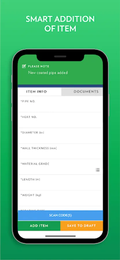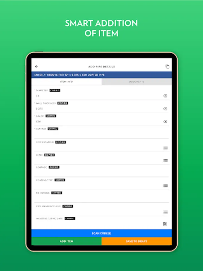 * Enables user to collect material and attribute information on a mobile application and attach required documentation.
