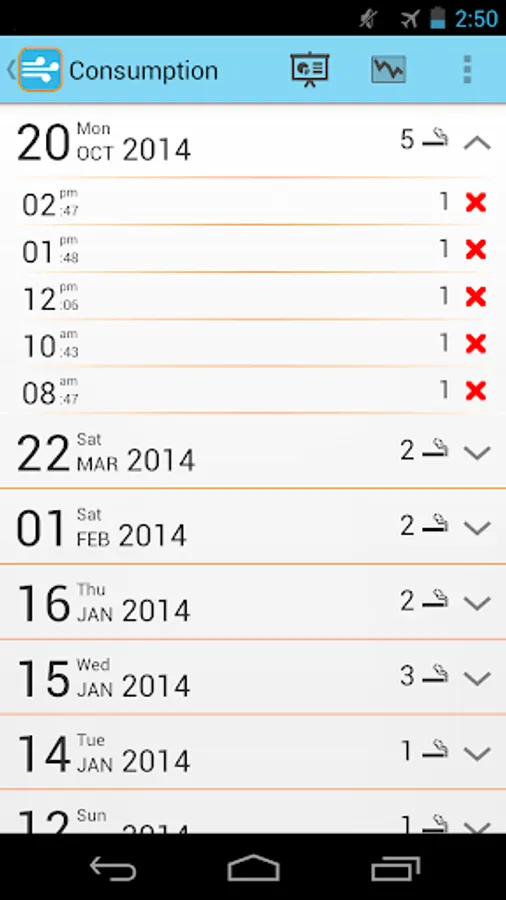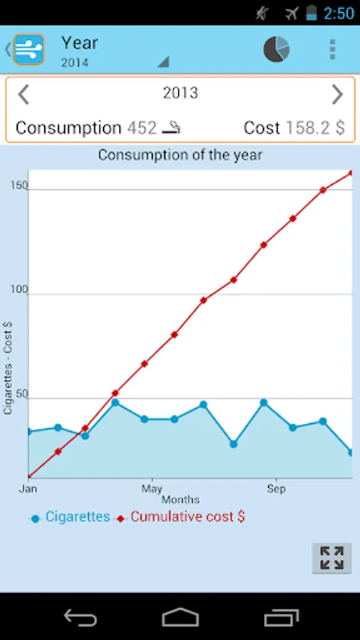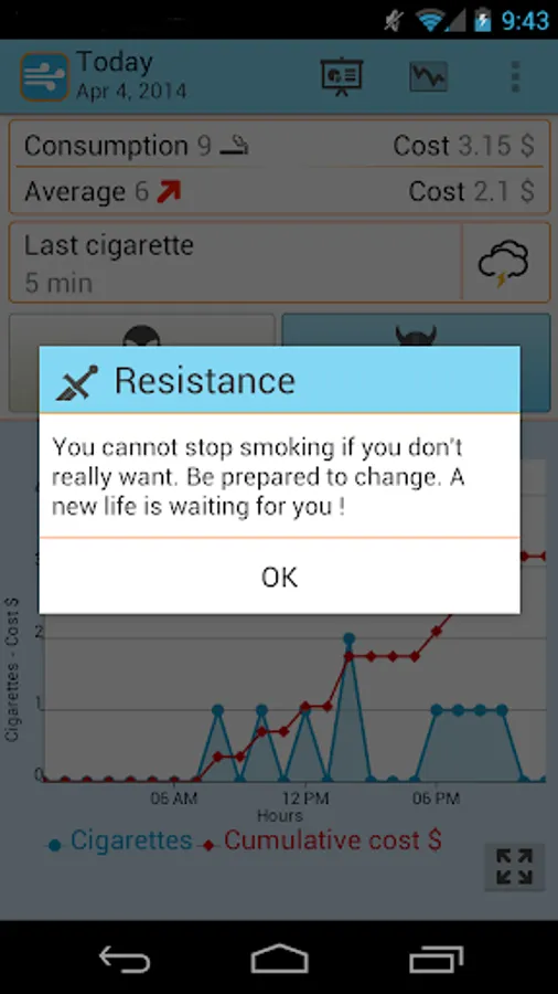 With interactive charts you can report the number of smoked cigarettes and the costs involved. Watch your consumption by week, month or year. When you don't smoke you can also see a preview of the savings you can make.