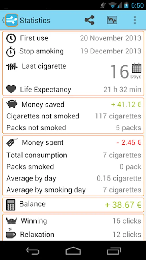 Tell your loved ones that you have stopped smoking . Share your progress and unlocked achievements. You can share via SMS, email and your favorite applications.