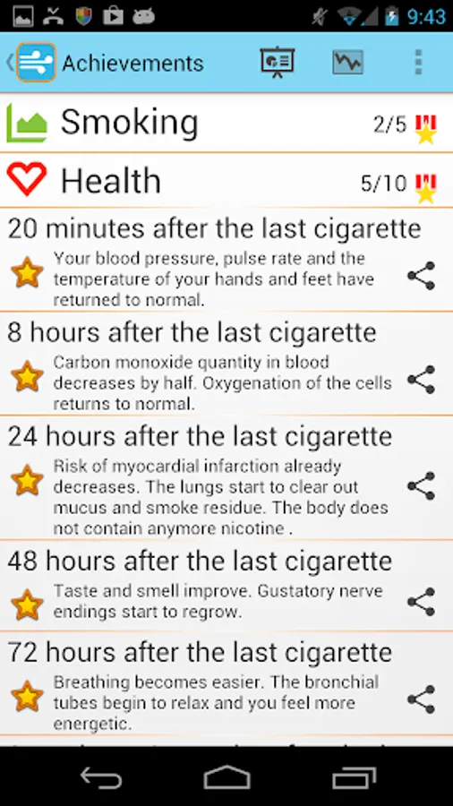 It is important to set goals. There are 70 achievements to unlock (33 in the free version) to stay motivated. They are divided into 4 categories: Consumption, Health, Smoke free, Resistance.