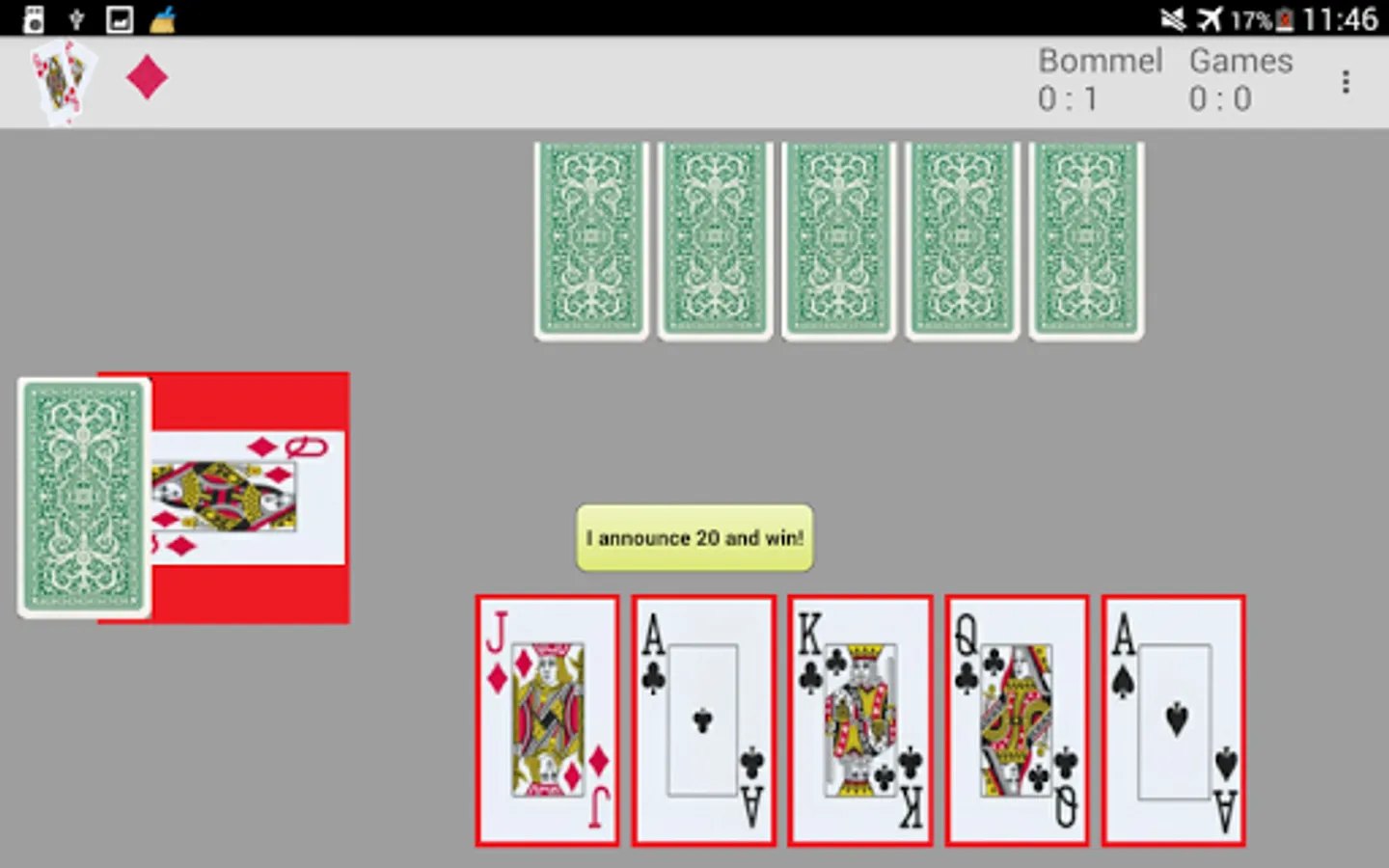 - Champion: Very strong playing. It is hard to beat the app in the end game. To win a high level of concentration and good cards are prerequisites. I believe to be a very strong player. But I loose