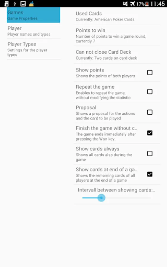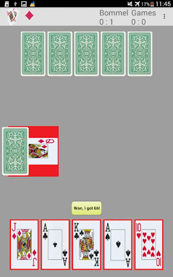 Computers have an advantage in calculable situations. They do not miscalculate or forget cards. So SiytySix Champion plays quite strong, particularly in the end game. It is not fun to loose in the majority of cases. Therefor SixtySix Champion offers four player types:
