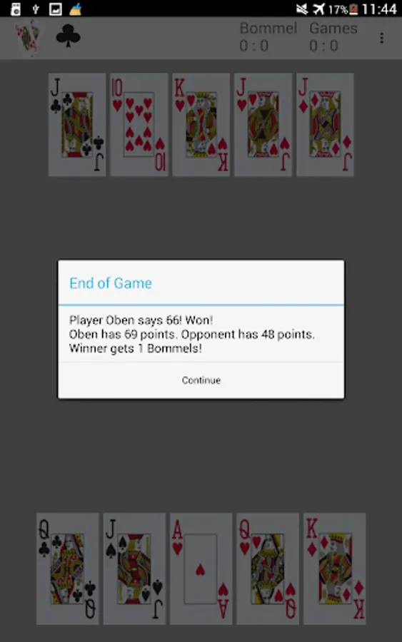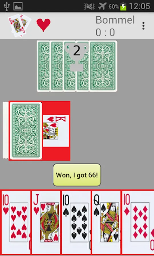 The game is played with 20 cards. For each color these are Ace (A) , Ten (10) , King (K) , Queen (O), and Jack (U). Winner is who reaches 66 points first and announce this. Depending on the points earned already by the opponent the winner gets 1 to 3 Bommel. With 7 Bommel the game round is won. The rules of Sixty-six are rather simple. SixtySix Champion uses rules similar to the Schnapsen variant of https://en.wikipedia.org/wiki/Sixty-six_(card_game) . If no player announces 66 then the winner of the last trick wins the game.