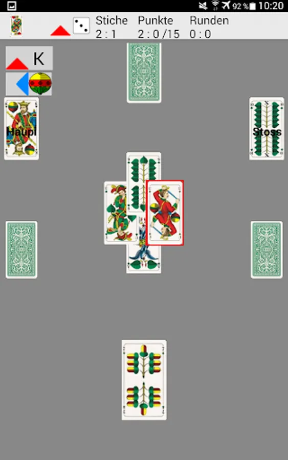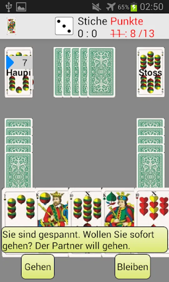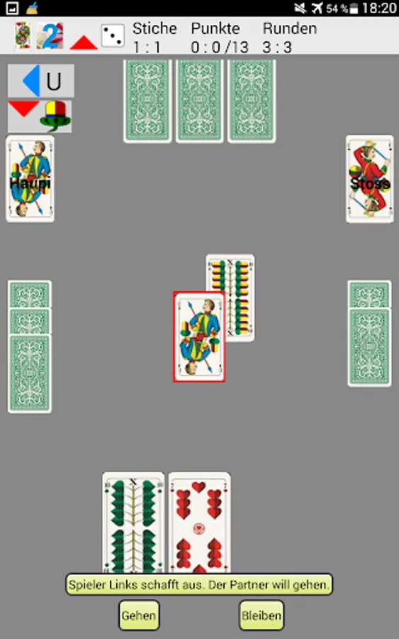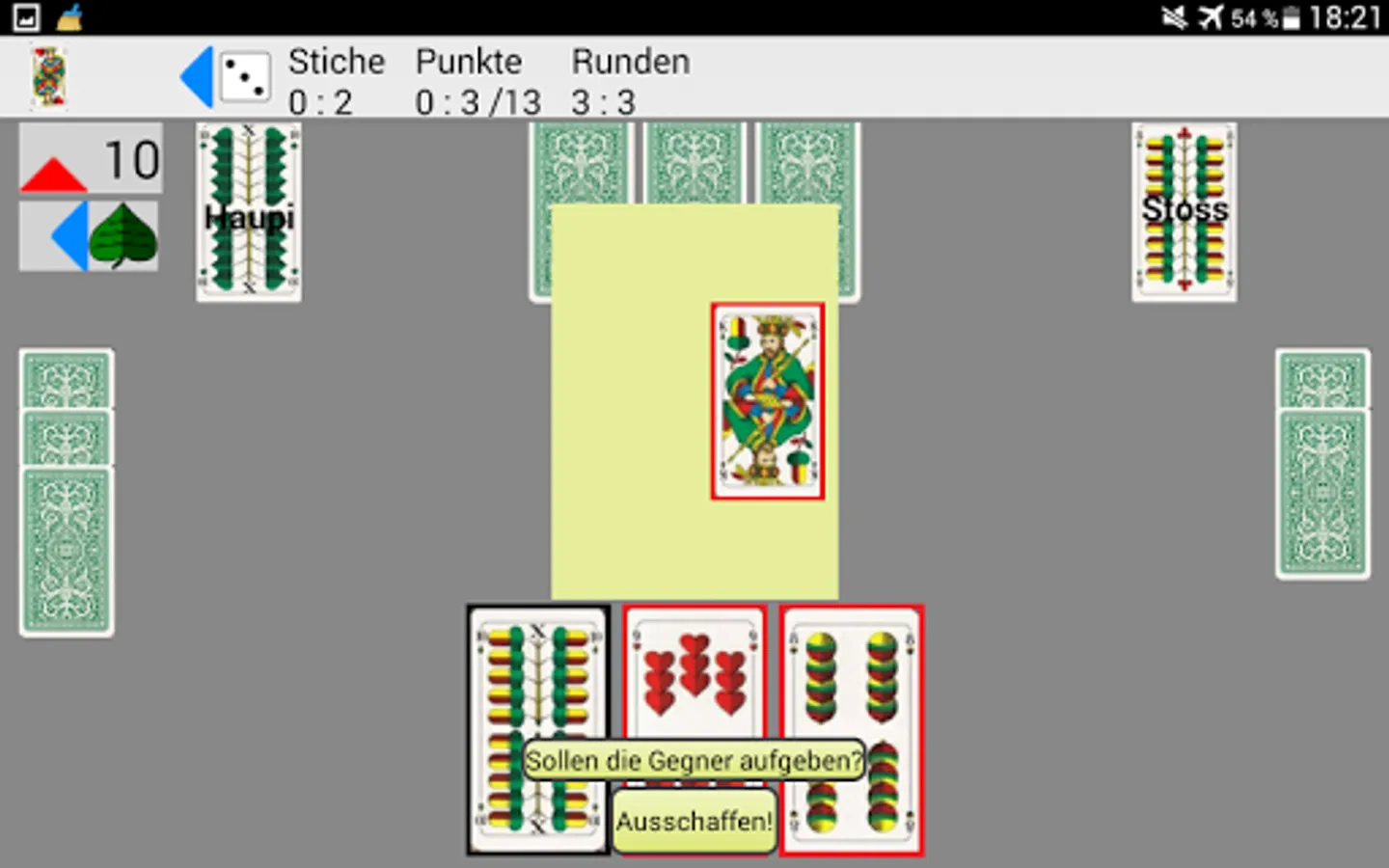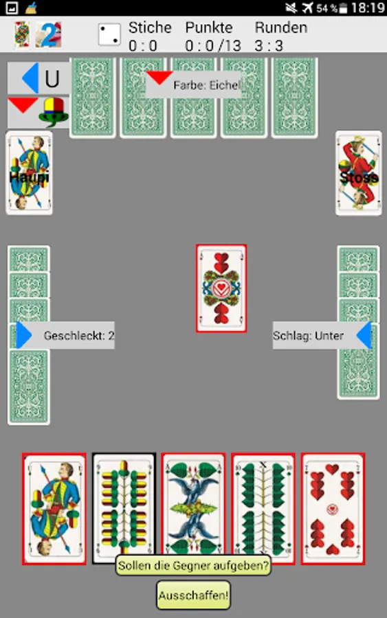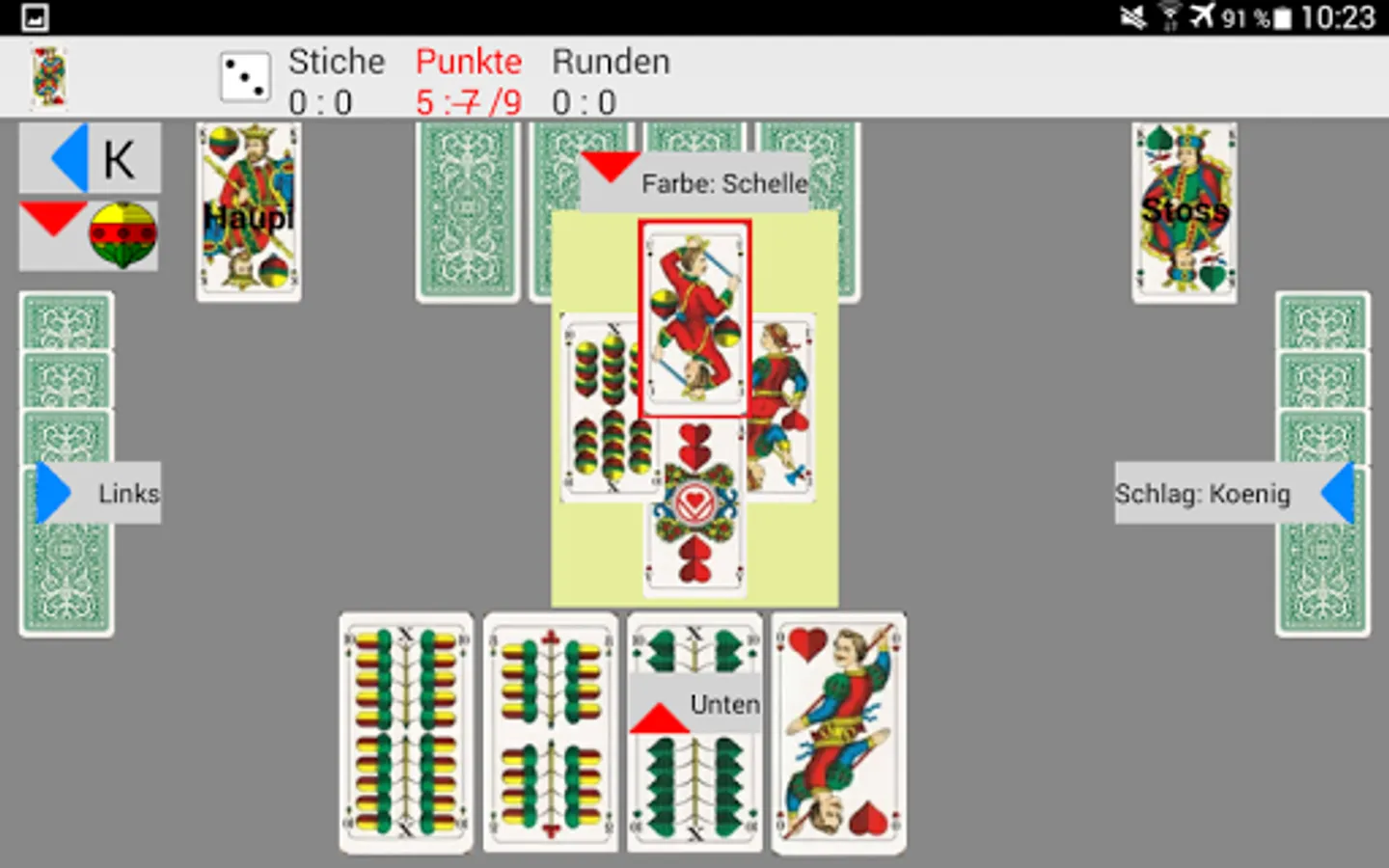 A major difference from Watten Champion to other Watten Apps is that it supports called type hinting, also mark -in the Premium version-. Here a player can show his partner that he as a particular card the Belli possesses. Of course, the opponent can hinting notice.