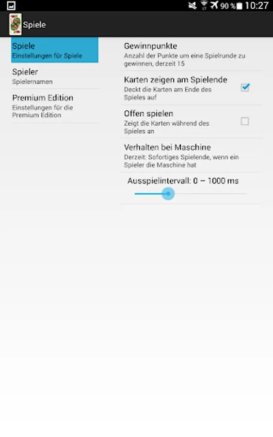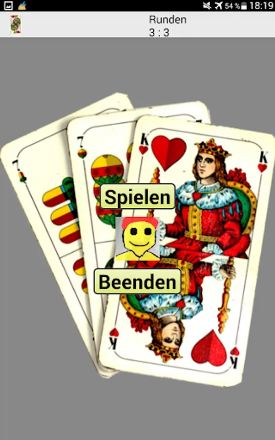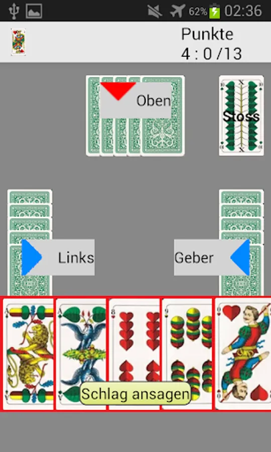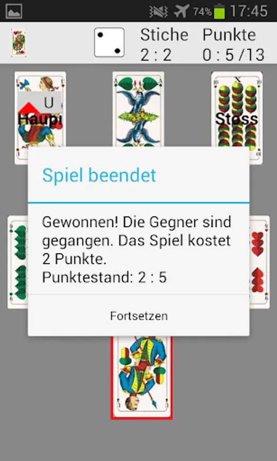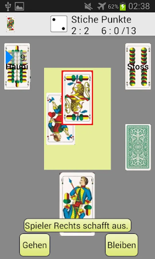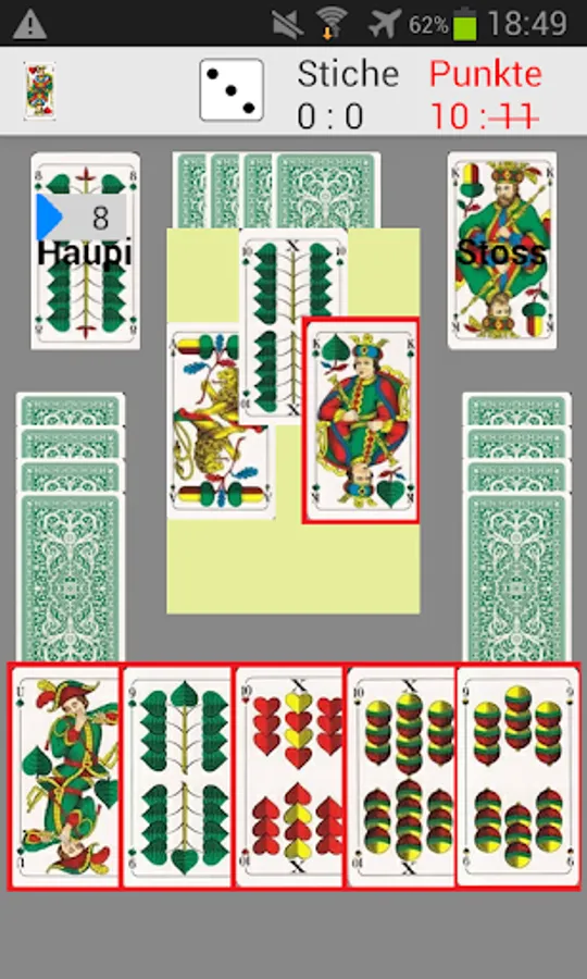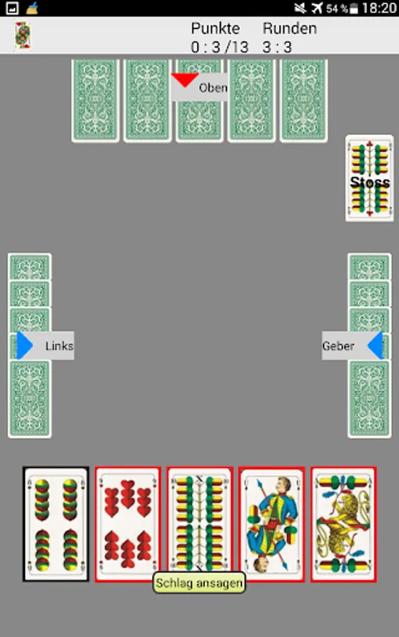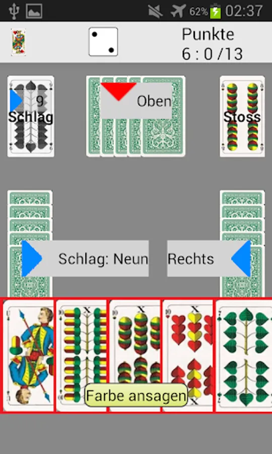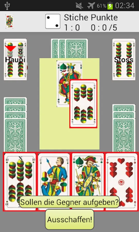 A major difference from Watten Champion to other Watten Apps is that it supports called type hinting, also mark -in the Premium version-. Here a player can show his partner that he as a particular card the Belli possesses. Of course, the opponent can hinting notice.