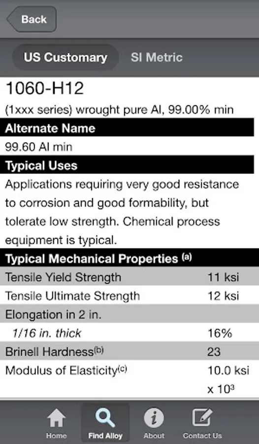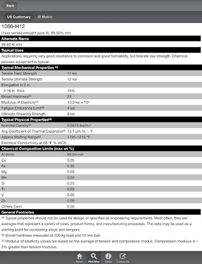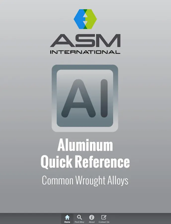 The Aluminum Quick Reference, created by ASM International, provides ready reference data on more than 200 common wrought pure aluminum and aluminum alloy designation-temper combinations. Content includes typical mechanical and physical properties (both US Customary and SI Metric values), chemical composition limits, and typical uses by alloy-temper designation. The app can be used by itself or as a companion to the ASM Alloy Center Database™, which includes property data for more than 100,000 alloys in the US and globally.