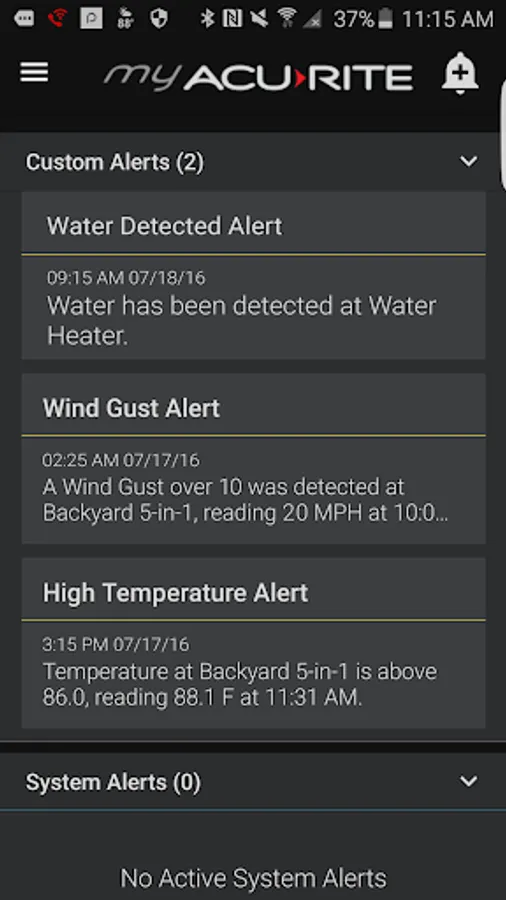 Get notified of changes in your home and outdoor environments. Create email and phone alerts to know when conditions exceed your desired range and may require your attention. The potential uses for My AcuRite’s weather alert app are practically limitless. Examples of customizable alerts include: