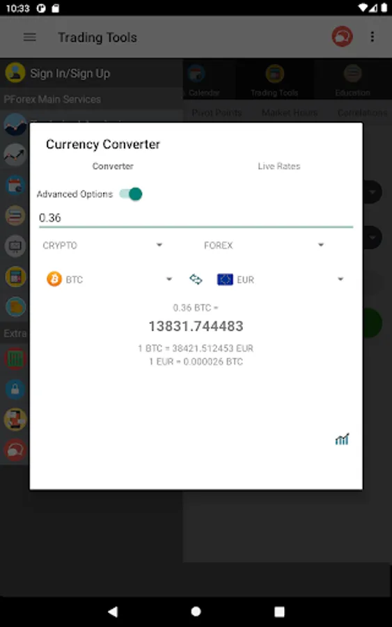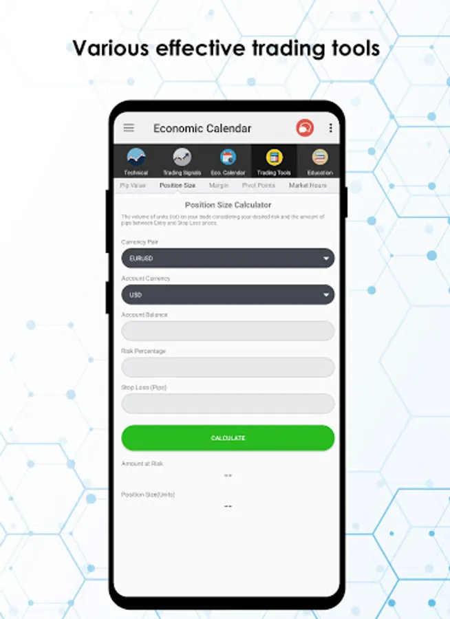 • Multiple live trading tools including pivot point levels, exchange rate converter, Pip value, position size, correlation coefficient, Margin calculator