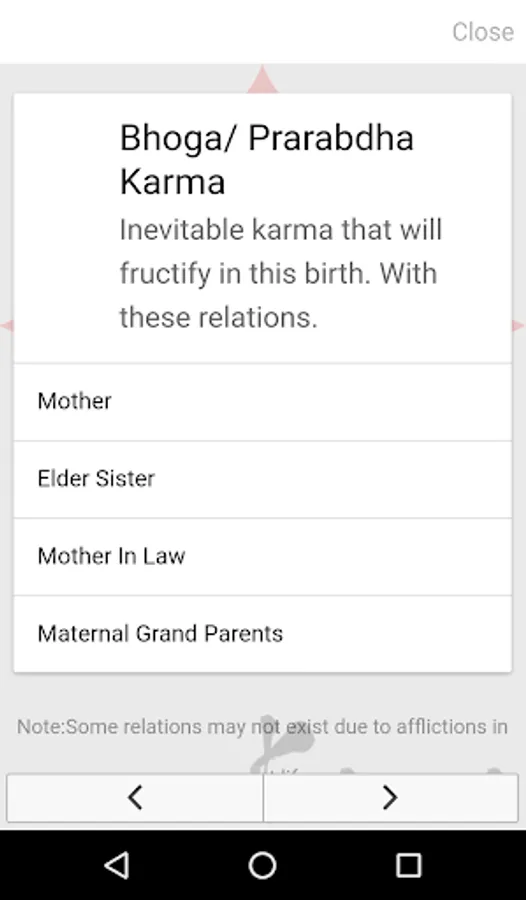 We are limiting this version to the relations in your life and the karmic balances you share with them. Some of the relations may not exist in this birth due to karmic and planetary afflictions.It is important to understand that just like you have not chosen your parents, nor have you chosen your blood relatives. The Universe chooses the right womb for birth only so that you consume your karma for that birth! Hope this app helps you understand your karmic linkages better.
