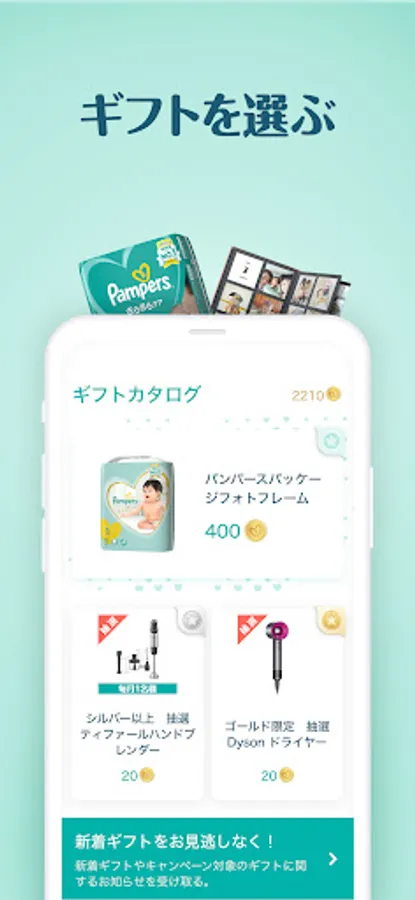We offer great gifts for babies and families with babies. Gifts that can be exchanged, such as baby wipes, start at 200 points! You can easily exchange from "Gift Catalog" in the app menu. More gifts will be added, so be sure to check the Baby Gift Catalog regularly.