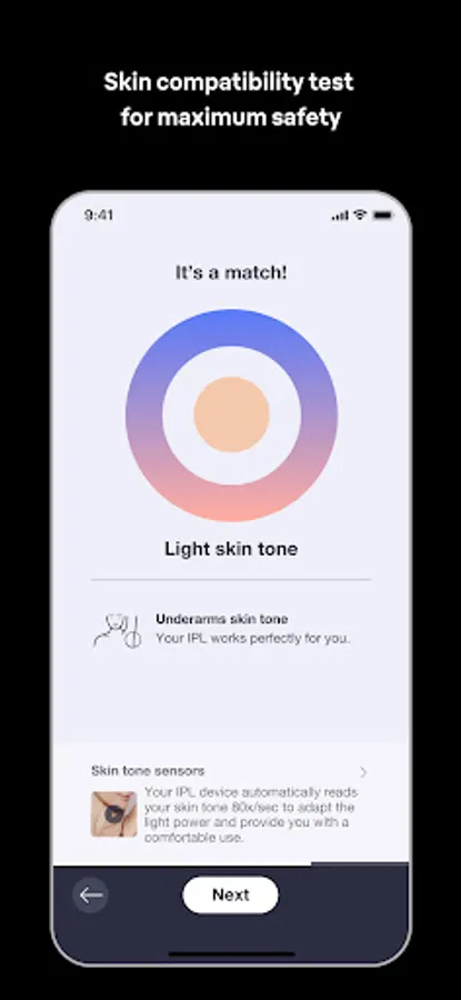 Skin i·expert will conduct an initial skin check to confirm compatibility of the technology to your skin tone. During the session, it is the only IPL device** that reads your skin tone 80x per second and automatically adapts the light for the right power with every flash. This ensures ultimate safety and optimal results.