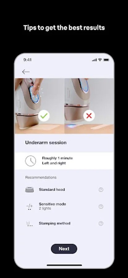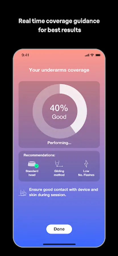 No more guessing while using your IPL, with the Skin i·expert app you will know that you're doing it right. The intelligent system guides you in real-time to avoid missed spots and informs you on the best attachment head to use for each specific body area. At the end of each session, it advises on how to improve your IPL technique so that you can get better time after time.