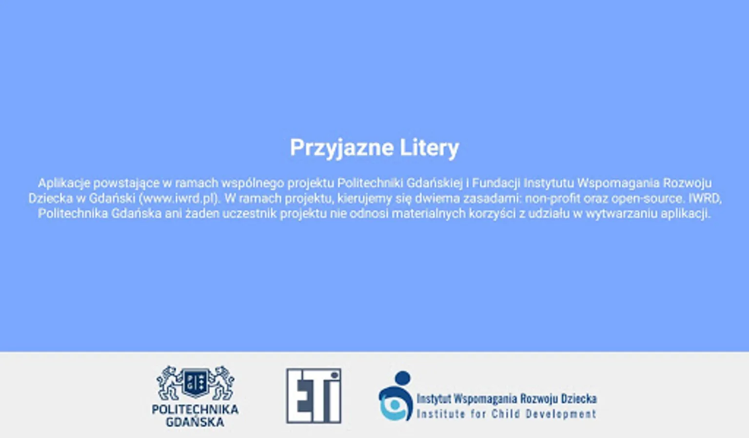 Friendly Letters is an application supporting the development of fine motor skills in children by drawing letters and numbers displayed. To adapt the software to work with autistic children, it was created in close cooperation with the Institute for Child Development in Gdańsk. However, high software configurability ensures comfortable fun for all children.