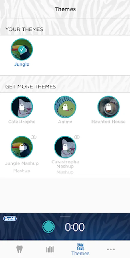 The first Oral-B Fun Zone theme available is the Jungle. The Anime, Cats and the Haunted House themes can be unlocked by acquiring points for improved oral care habits, such as brushing for the dentist recommended time of two minutes or a pressure free brushing session. Age restrictions apply for themes.