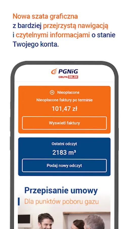 The mBOK PGNiG application gives you the opportunity to freely manage your bills, readings and contracts. You can not only quickly pay the invoice or provide a reading of your gas meter or meter status, but also get acquainted with the current offer of PGNiG OD and make changes to your contract.