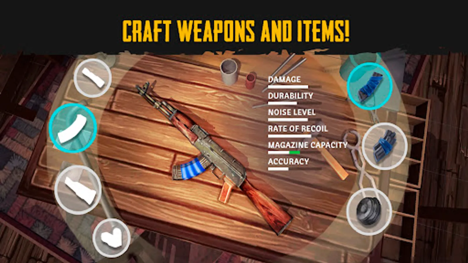 Our survive game is unpredictable: the victim can always become a hunter. Create power weapons like AK-47, M4, SVD, Revolver, UZI, Glock, etc., and always be ready to survive!