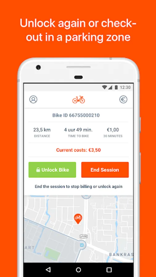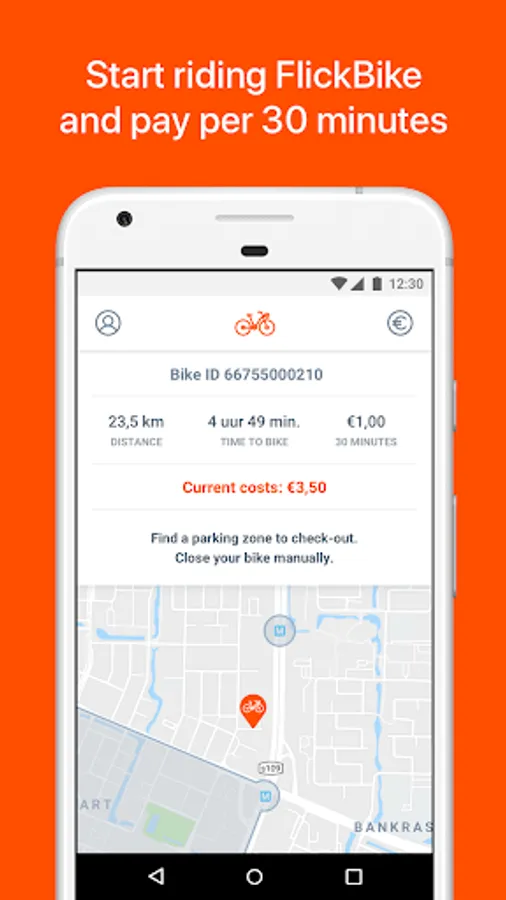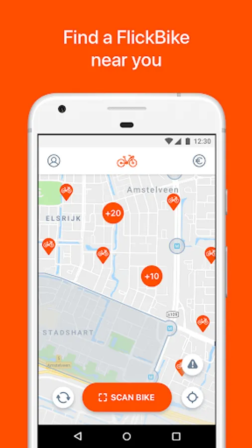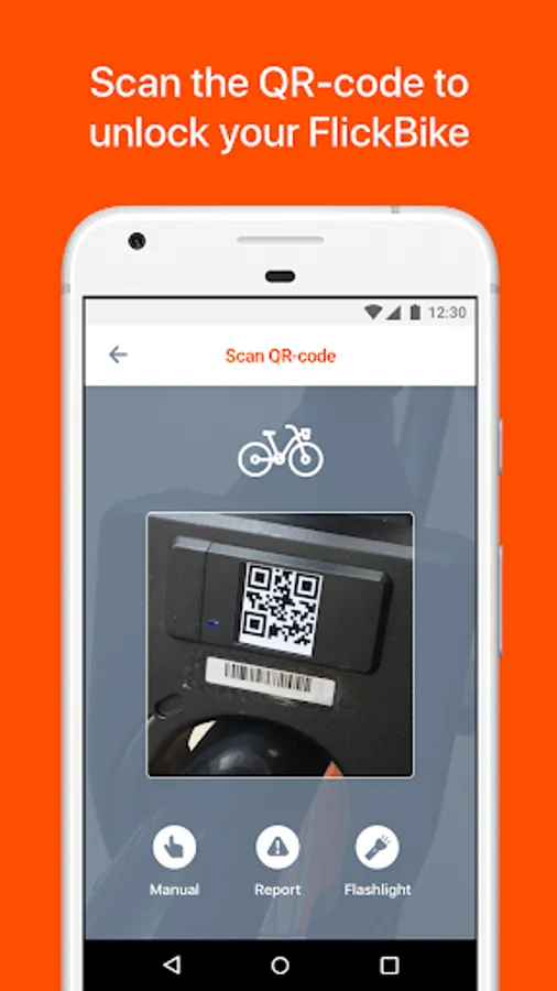 Download the mobile app to find your nearest FlickBike. Unlock the bike with the app by scanning the QR code and off you go. Don't worry about returning the bike, find a parking zone on the map and park inside the zone to check out your FlickBike.