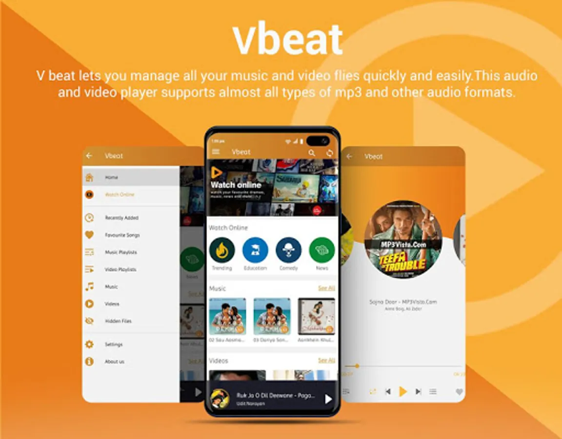 VBEAT is a professional Music and Video Media player, supporting all music & HD video file types. One of the most efficient and easy to use mp3, mp4 player for Android with rich user experience. It helps you to find all the music files from your file system in seconds. It supports all popular music formats and high definition videos (avi player, mkv), all in one solution.
