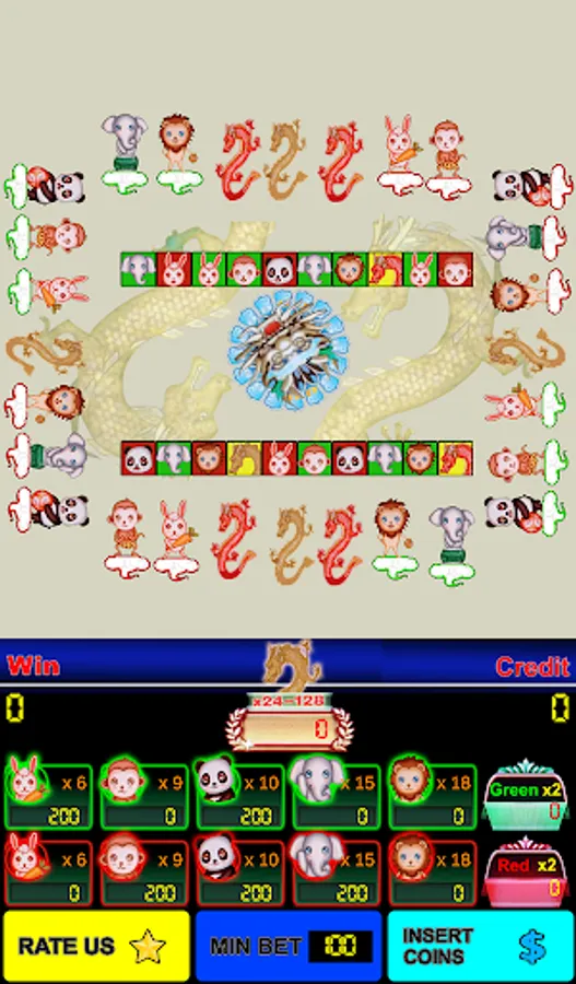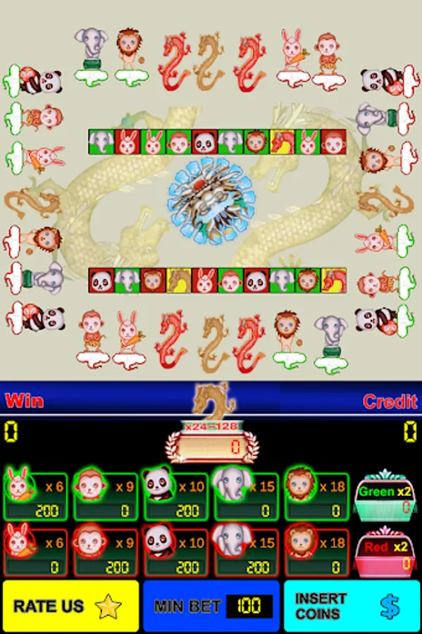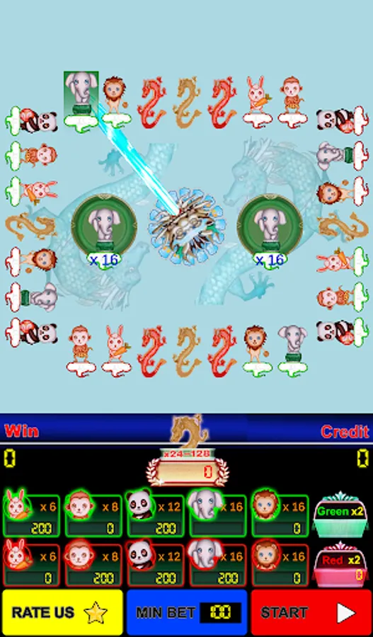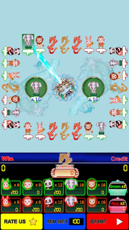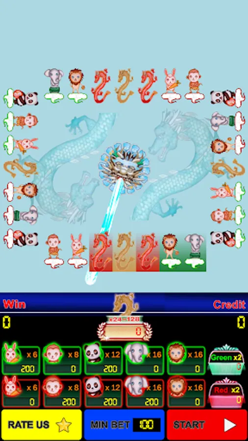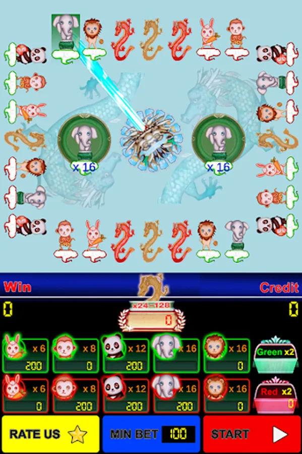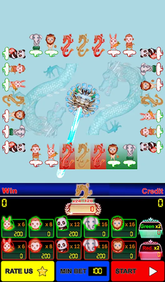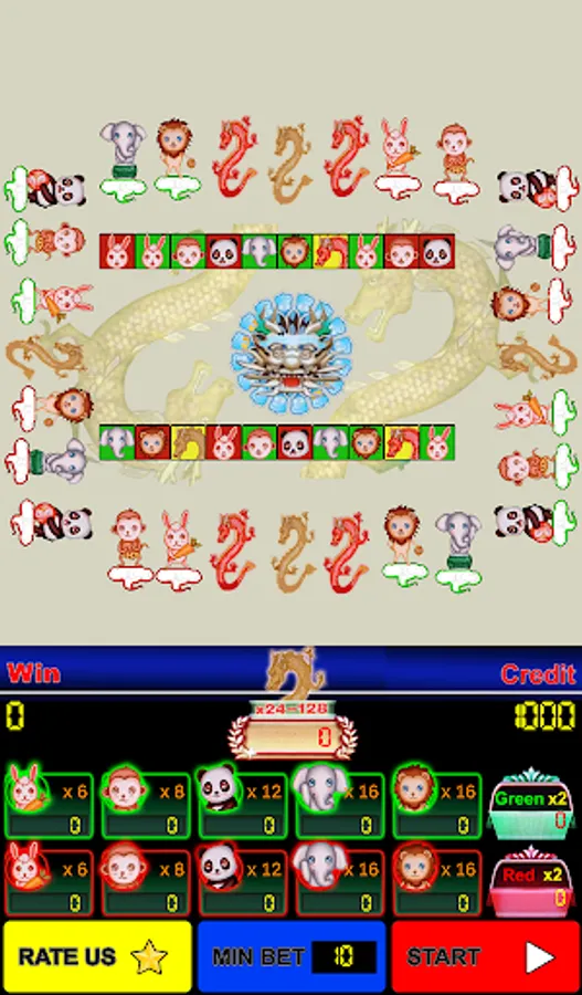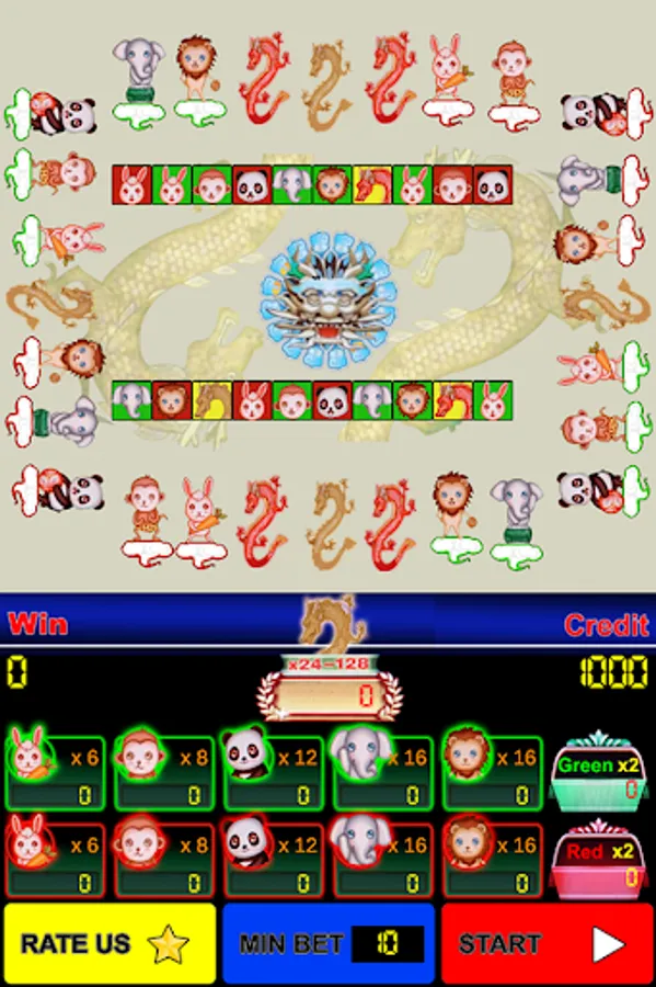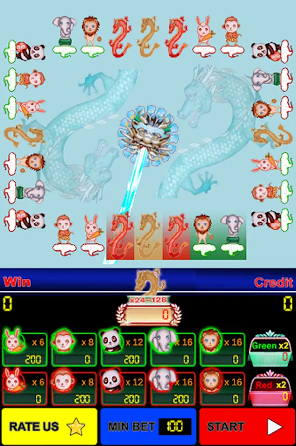 - Players may choose to wager on eleven outcomes: Dragon, Green (Rabbit, MonKey, Panda, Elephant, Lion), Red (Rabbit, MonKey, Panda, Elephant, Lion) then touch Play button. Players also betting with red, green color only.