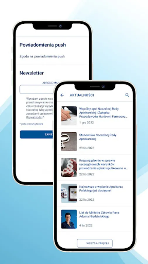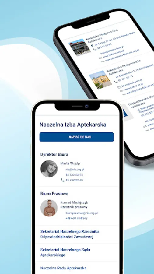 The NIA application allows you to get acquainted with the most important information of the Supreme Pharmaceutical Chamber. It contains news, contact details of the Pharmacy Self-Government bodies, a list of legal acts important in the work of a pharmacist. The application does not require logging in.