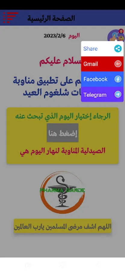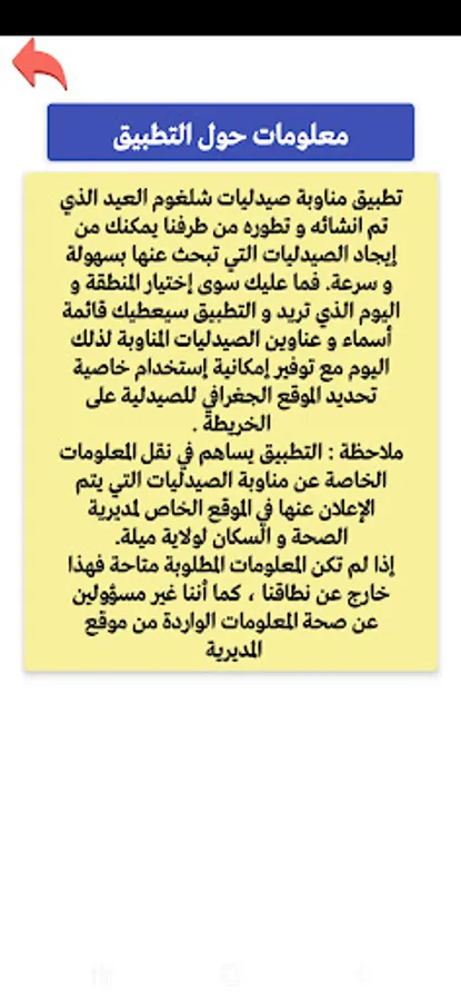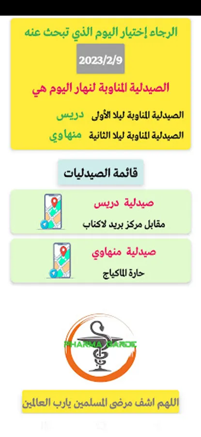 The application of the duty of Shalghoum Al-Eid pharmacies (pharma garde) is an application that helps you to know the location and name of the pharmacy on duty at night by pressing a button on the date of the day you want, and it is only for the municipality of Shalghoum Al-Eid