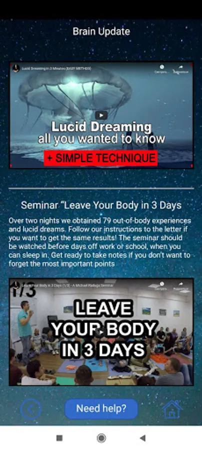 A wide range of techniques, books, videos, and programs to launch your lucid dreaming practice or OBE just right tonight! This free app is based on Michael Raduga's works and Phase Research Center studies.