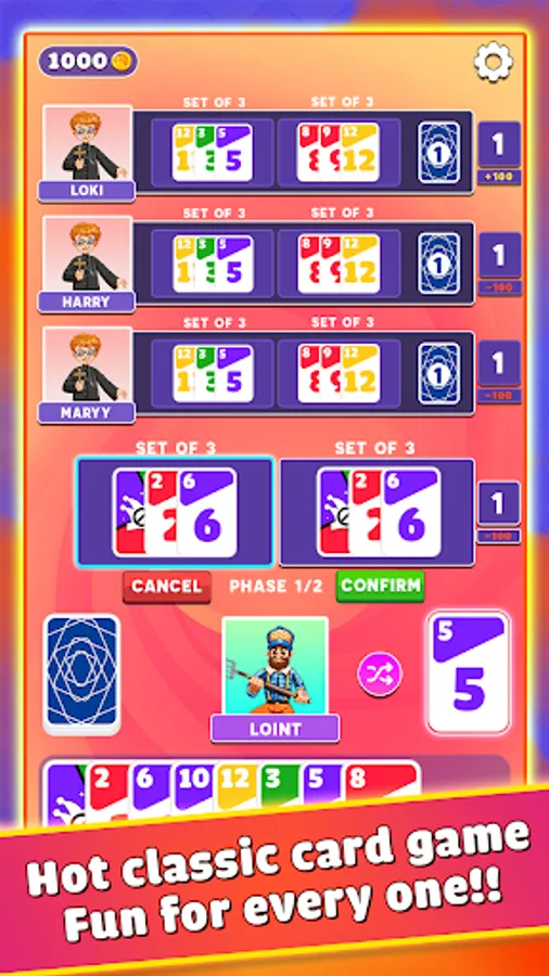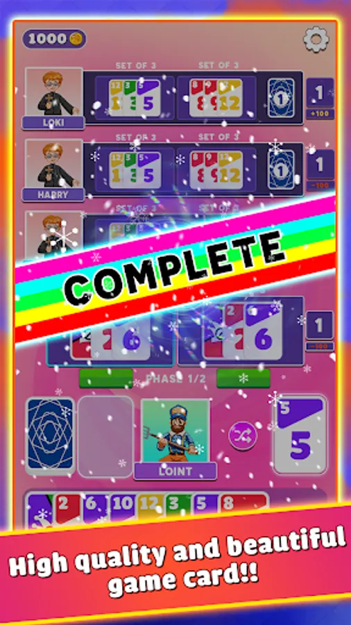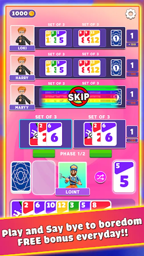 Play smart and you will be the winner. It is a game of skill and strategy. To be the first player to complete all 10 phases. In case of the tie, the player with the lowest score is the winner.