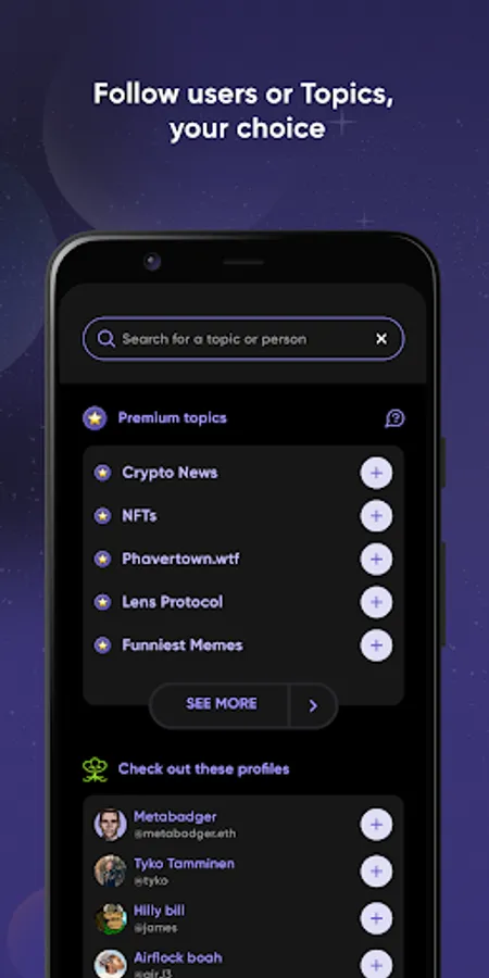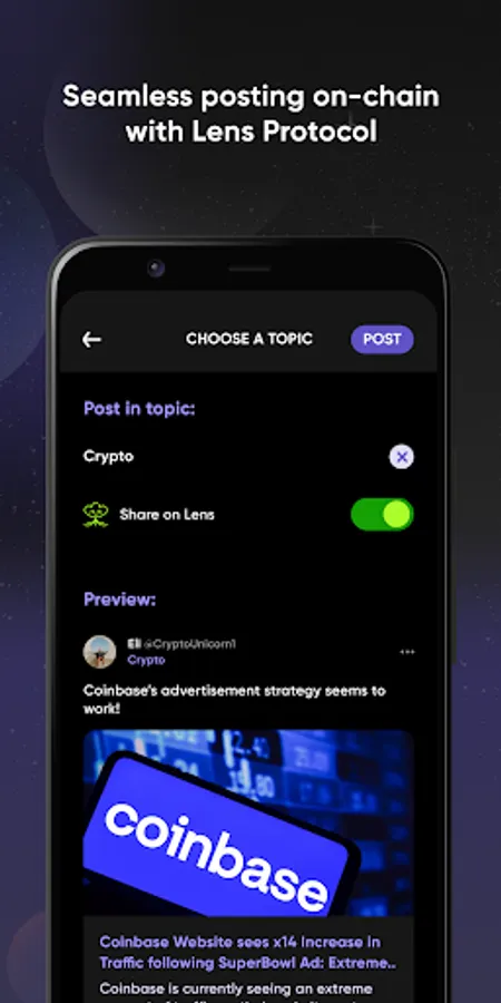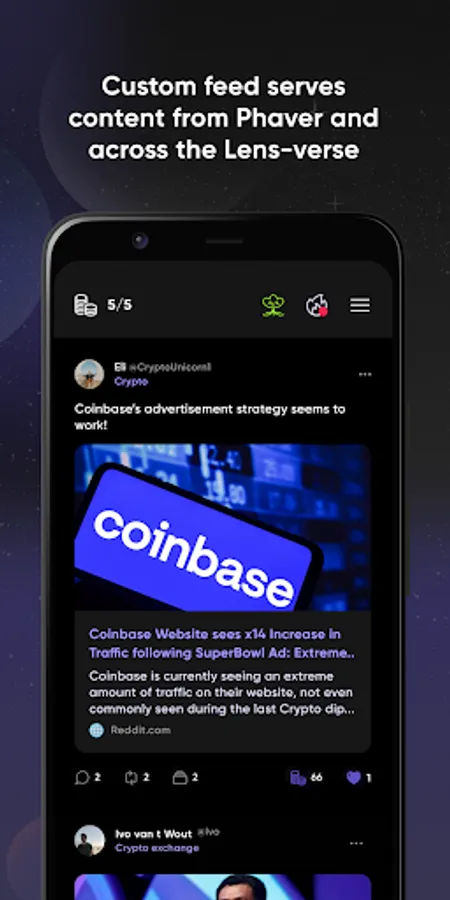 Phaver's decentralized social app brings you the best of Web3 without the complex UX that usually comes along with it. Access the Lens Protocol social graph even without a Lens profile or make your own on-chain posts and follows by connecting your Lens to Phaver. Gamified features help your posts reach more people and reward you with points that will be tradeable for tokens in the future and multi-wallet support allows you to showcase all your coolest NFTs, from Apes to soulbound tokens.