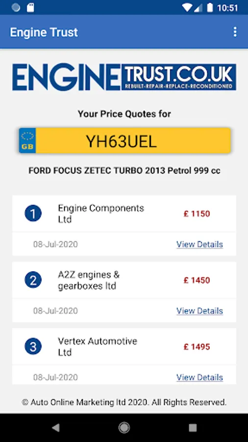 Simply enter your reg. details to get an engine quote with few clicks. After you have entered your details we will search our database to find out who has the particular used or reconditioned engine in their stock and fetch prices for you. Engine Trust is different from all other price comparison websites because we have a huge network of trusted replacement engine suppliers, the service is free and easy to use and you get your quotes in just few clicks.