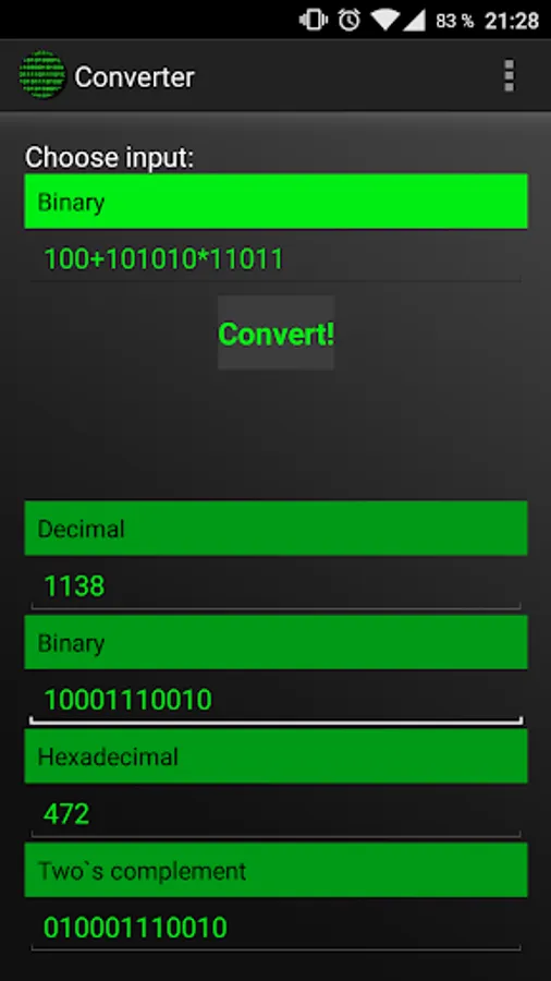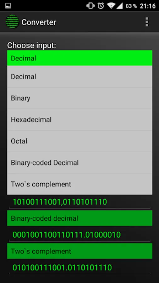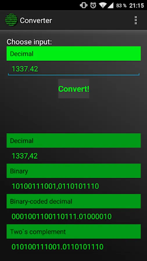 - Converting numbers to decimal, binary, hexadecimal, octal, binary-coded decimal, two's complement and floating point numbers